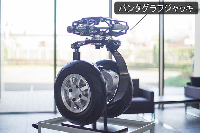 特徴的なのは、操舵を行うアクチュエータがないこと。パンタグラフ部は車体に固定されていますが、その下の部分はフリーに回転できるようになっていて、左右2輪それぞれの回転速度に差をつけたり、回転する向きをそれぞれ逆向きにしたりすることで曲がることができます。「走る」に加えて「曲がる」の機能を実現するために、1モジュールにつき2輪あるわけですね。
